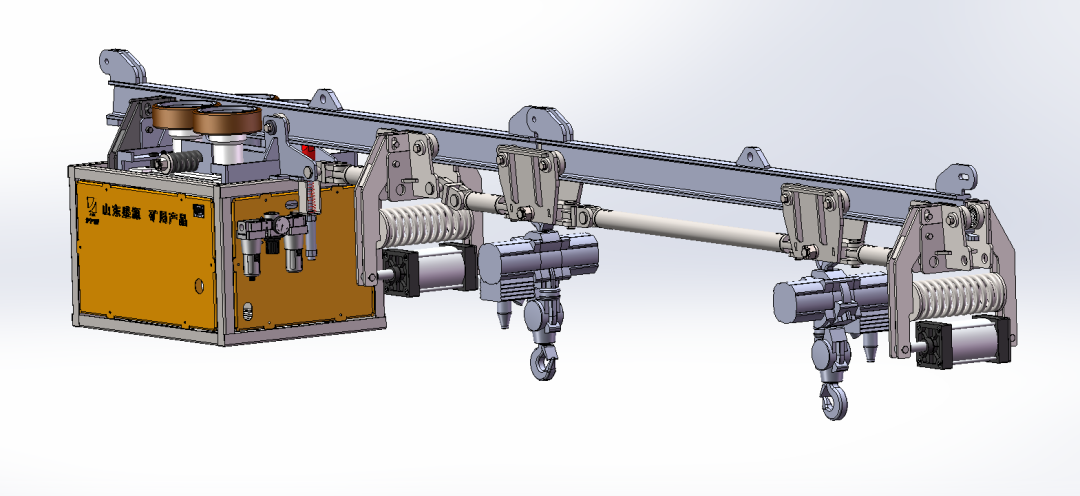 气动单轨吊车是该公司自主研发的一种专业节能环保、多功能、高效率的创新产品。采用压缩空气作为动力源,它具有安全、清洁和无污染的特点,并内置悬吊单轨系统,不受底板条件限制,具备卓越的通过能力。该产品广泛适用于煤矿井下、公路隧道、铁路隧道等特殊环境,可完成巷道中大型设备的组装、拆卸以及物料的短途运输。