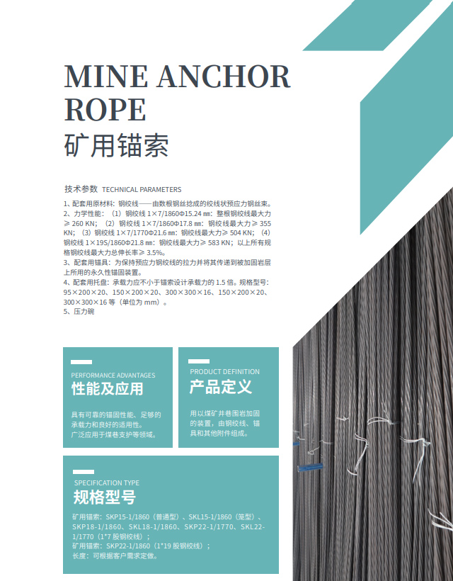 3. φ15.24*7.3 钢丝绳直径为15.24mm,钢丝绳层数为7.3层,适用于采用短锚杆的煤矿或硬岩矿山,可以承受较大的锚杆拉力。